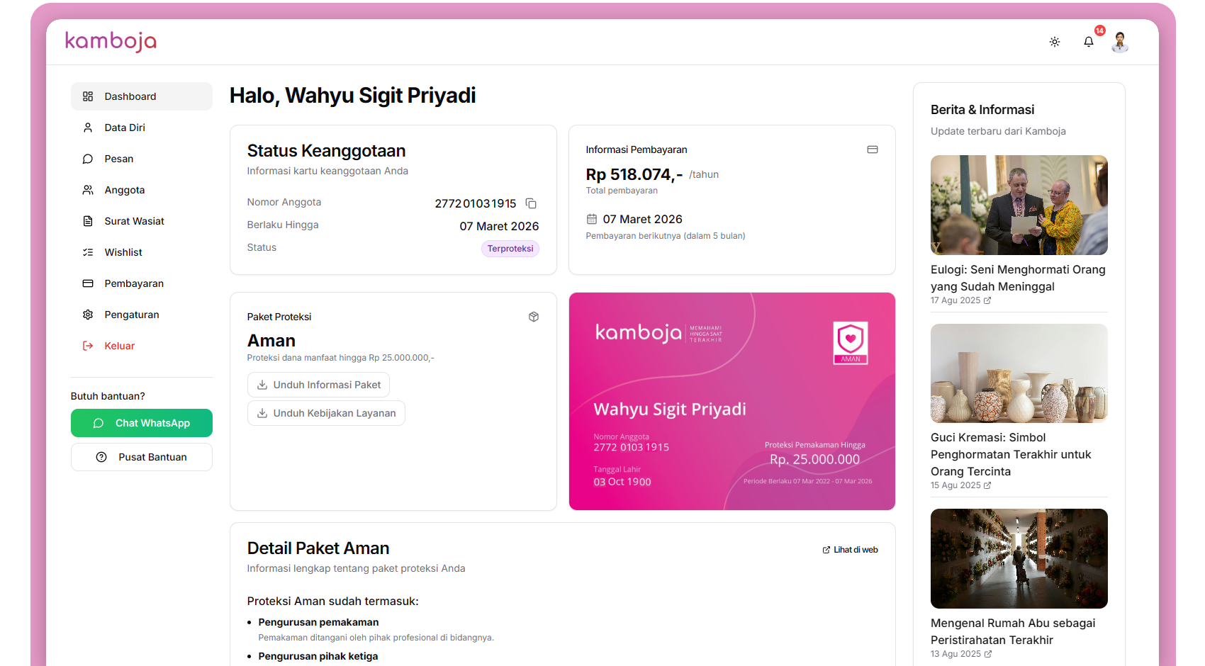 Kamboja akan membantu melayani segala sesuatu yang dibutuhkan saat prosesi kedukaan Anda, mulai dari pengurusan jenazah, hingga prosesi pemakaman atau kremasi termasuk pendanaanya.