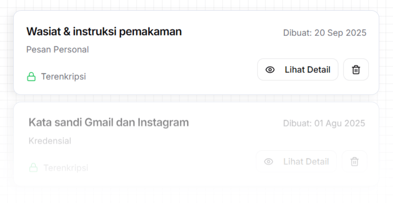 Fitur untuk menyusun, dan menyimpan surat wasiat secara aman dalam format digital, sehingga dapat diakses dan diteruskan kepada ahli waris sepeninggal Anda. Terenkripsi secara kuat dengan AES-256-CBC.