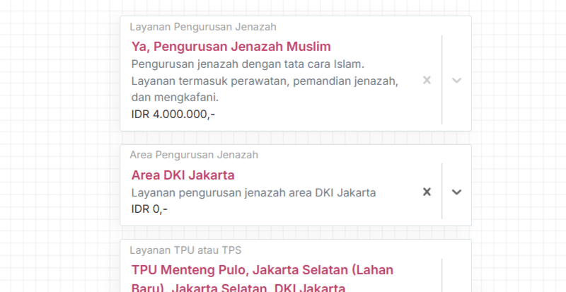 Catatan: Segala informasi dalam website ini dapat mengandung kesalahan, ketidakterkinian informasi atau kekeliruan seperti perbedaan detail produk, warna, jenis materi, harga, dll. Segala layanan yang tertera diatas hanya ilustrasi atau simulasi dan dapat berbeda saat prosesi berlangsung. Setiap pelayanan perlu di diskusikan terlebih dahulu bersama keluarga dan disesuaikan dengan kebutuhan serta anggaran yang tersedia. Mohon tanyakan segala keperluan anda kepada customer support kami untuk informasi terakurat.
